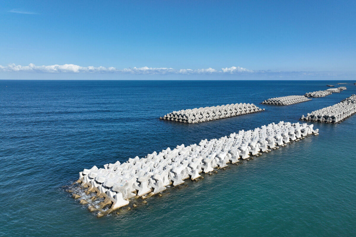 黒部のまちは海とともに歩んできましたが、波や潮流は土地を削り、人々の暮らしに影響を及ぼすこともあります。海岸護岸工事や離岸堤工事は、そうした自然の力から地域を守る大切な工事です。護岸で海岸を補強し、離岸堤で波を弱めることで、美しい海岸線や暮らしを未来へつなぎます。